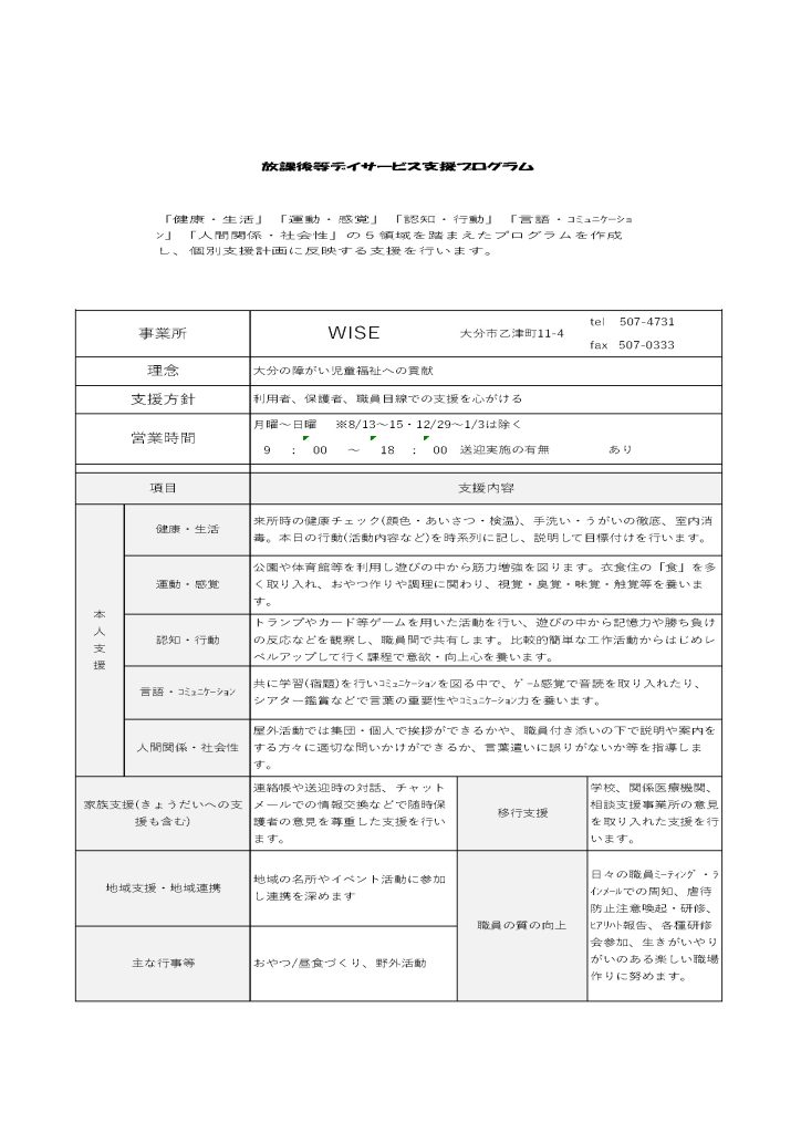 WISEでは、学習支援・運動支援・食育・社会体験の5つを柱に、一人ひとりの個性や発達段階に応じた支援を行っています。日々の宿題サポートはもちろん、専門的な視点を取り入れながら「わかる」「できる」を積み重ねます。手作りを大切にした食育活動では、調理体験を通して生活力や協調性を育み、食への関心を高めます。さらに、屋外活動や体験学習を通じて体力づくりや社会性の向上を支援します。子どもたちの健やかな成長と、ご家庭の安心につながるサービスを提供しています。